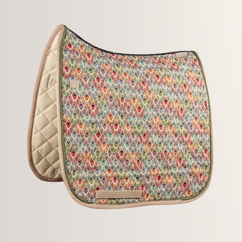 Liebevoll in der EU gefertigt und aus erstklassigen, farbechten Jacquard-Stoffen hergestellt, ist diese Sattelunterlage ein langlebiger Begleiter für Dich und Deinen vierbeinigen Freund. Mit DE GERDI wählst Du nicht nur herausragende Qualität und Eleganz, sondern auch zeitlosen Stil. Da diese Schabracke nur in begrenzter Stückzahl verfügbar ist, hältst Du ein wahres Unikat in den Händen, das die einzigartige Verbindung zu Deinem Pferd noch unterstreicht.