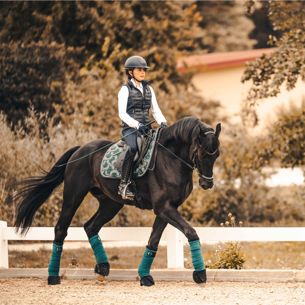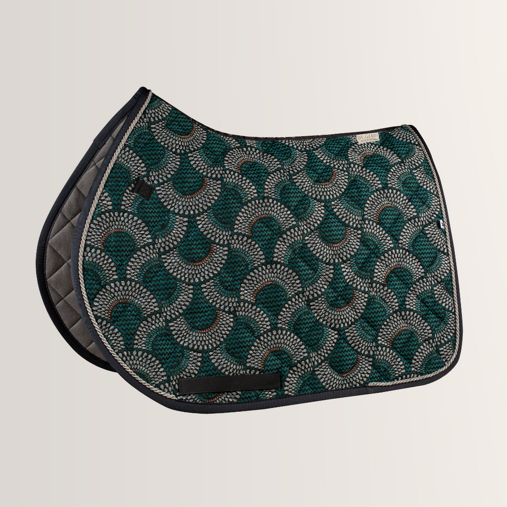 Unsere „Caleidoscope“ Satteldecke schenkt Dir und Deinem Pferd den höchsten Komfort. Das elegante Muster kombiniert tiefe Grün- und sanfte Blautöne, die an die schillernden Farben eines Kaleidoskops erinnern.