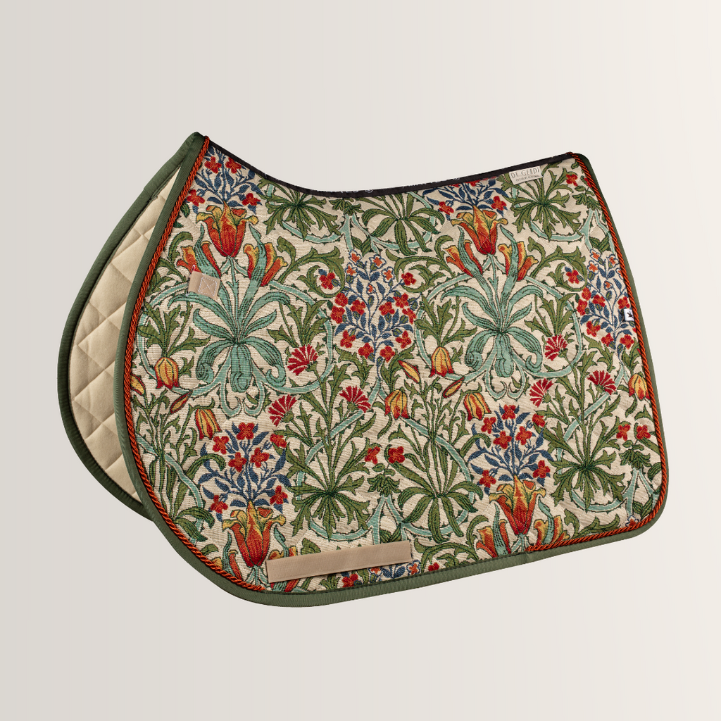 Unsere „Flowers are horses best friends“ Satteldecke schenkt Dir und Deinem Pferd den höchsten Komfort. Das kunstvolle Muster in satten Grün- und Rottönen verleiht der Decke eine elegante und zugleich lebendige Note.